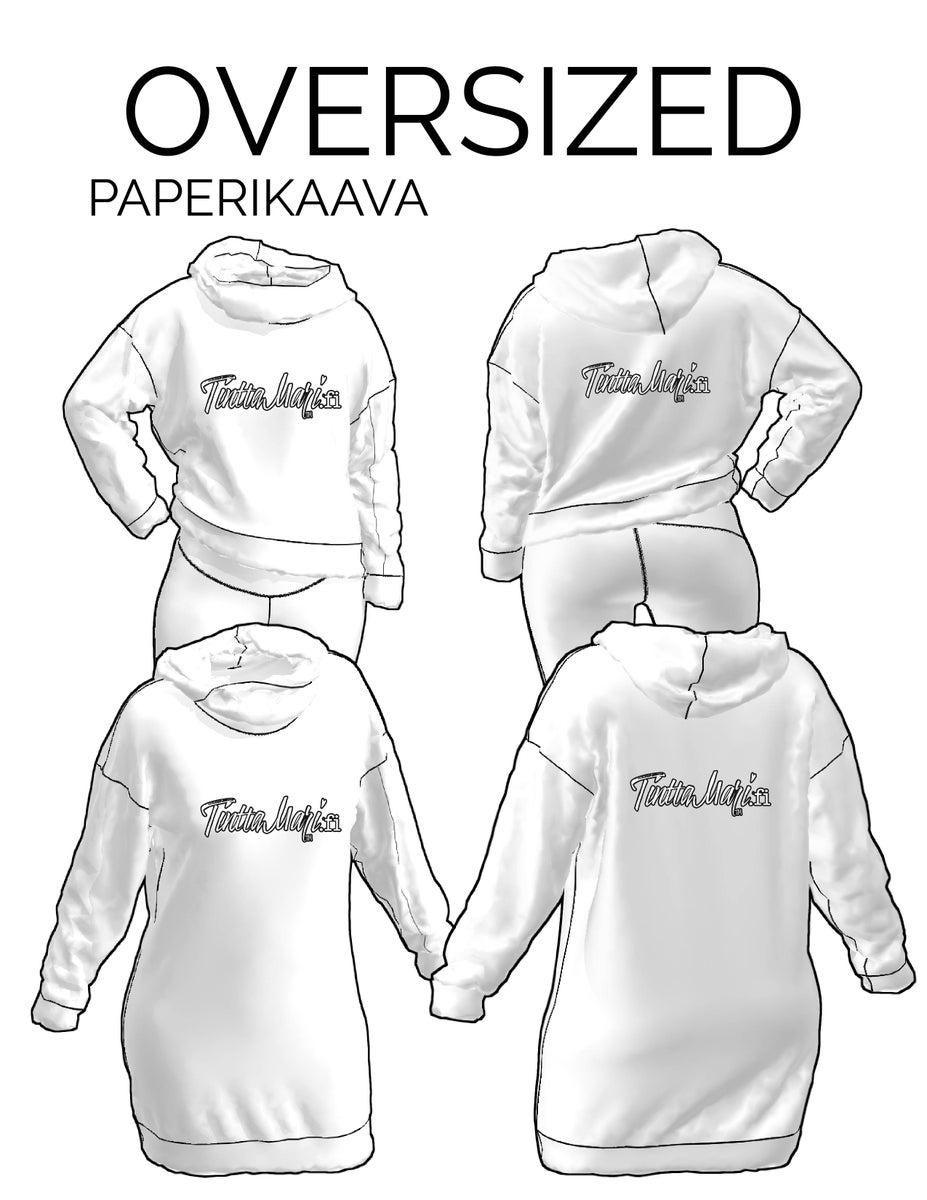 Kaavassa on 4 kokoa XXS-XXL. Pienimmät koot soveltuvat oversize malliksi myös teineille. Suttutaiteilija käyttää kokoa XXS/XS ollessaan 140cm pitkä. Paketti sisältää kaavan ja ompeluohjeet.